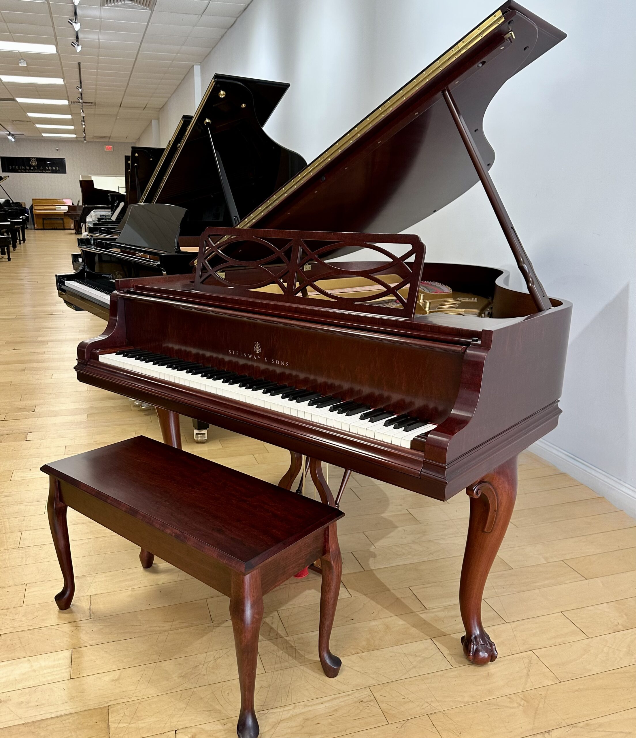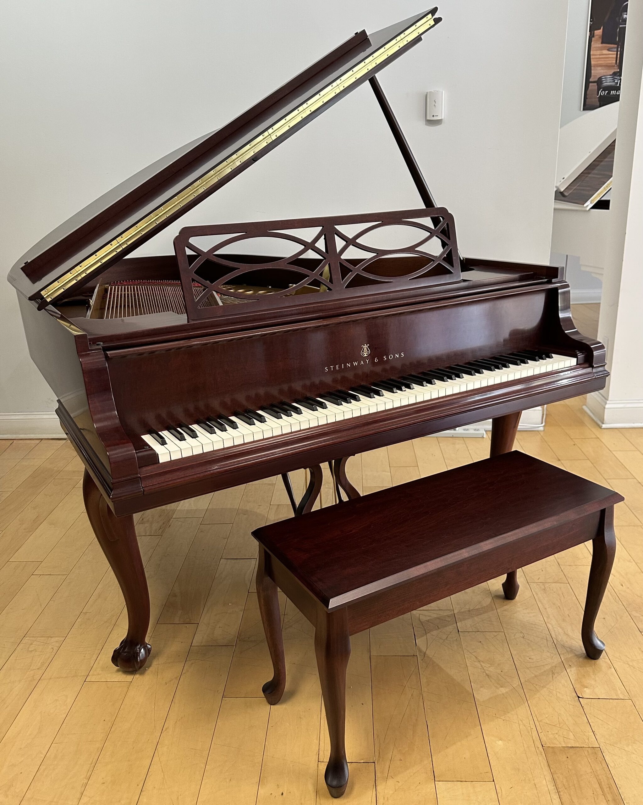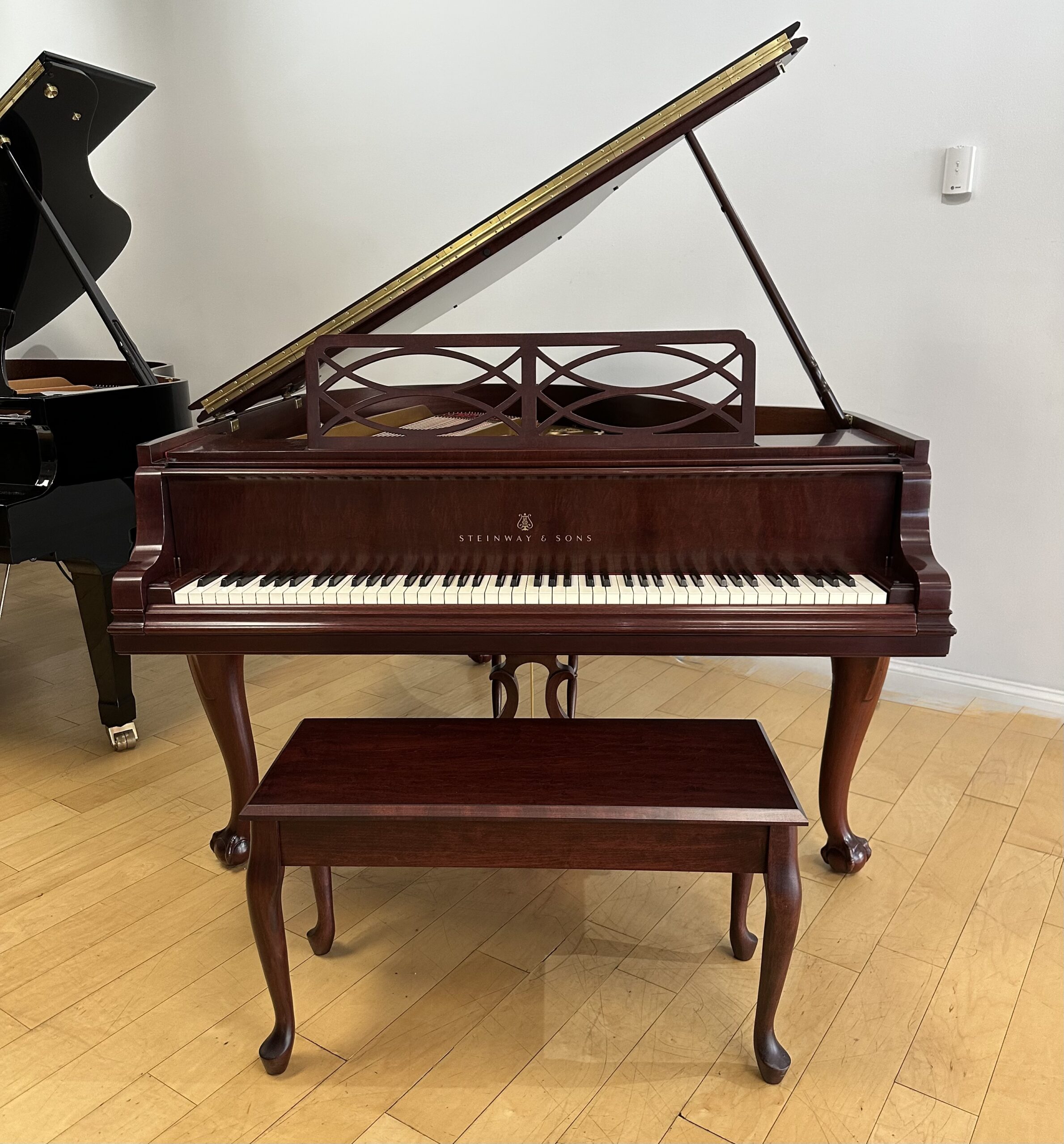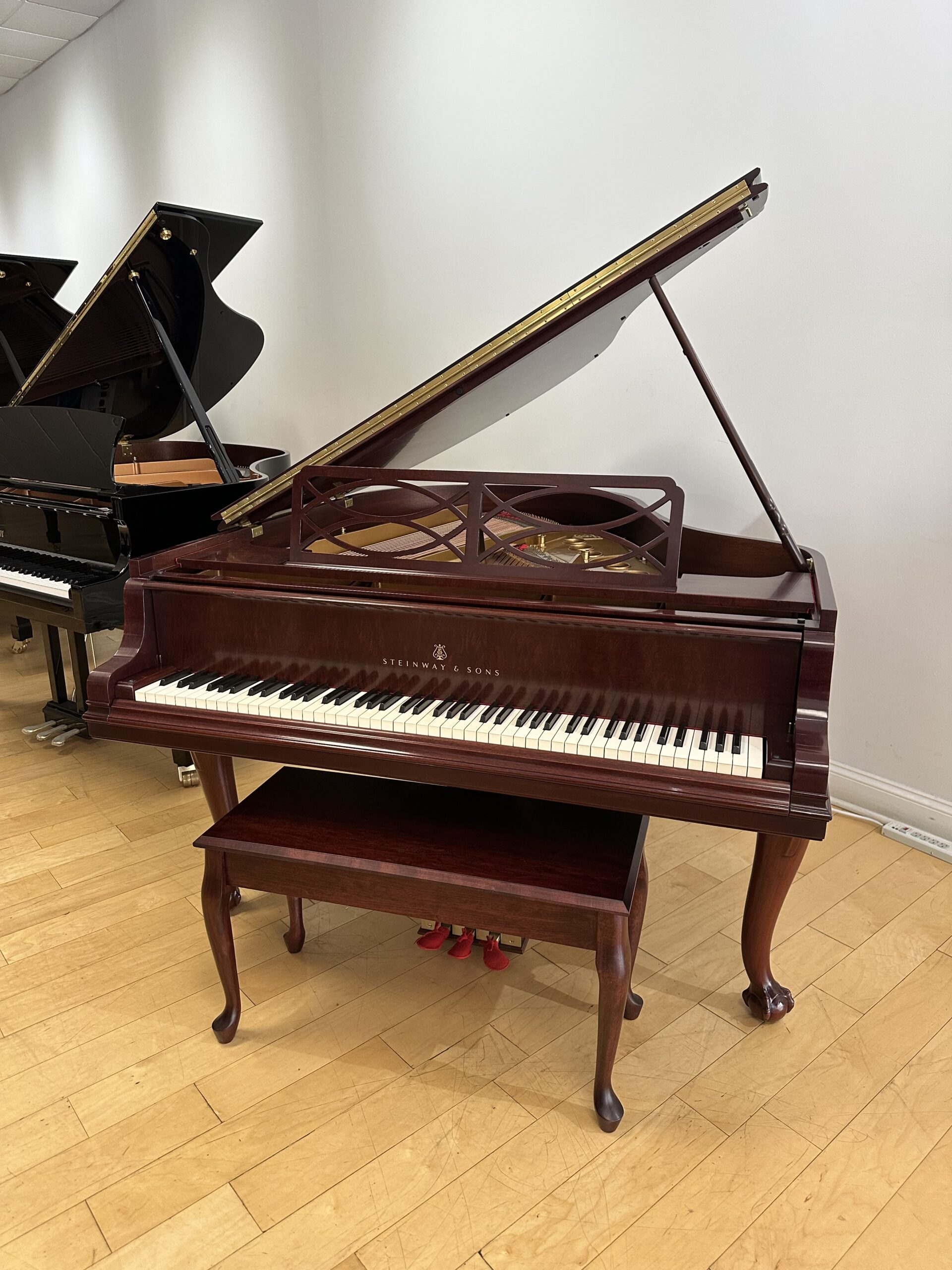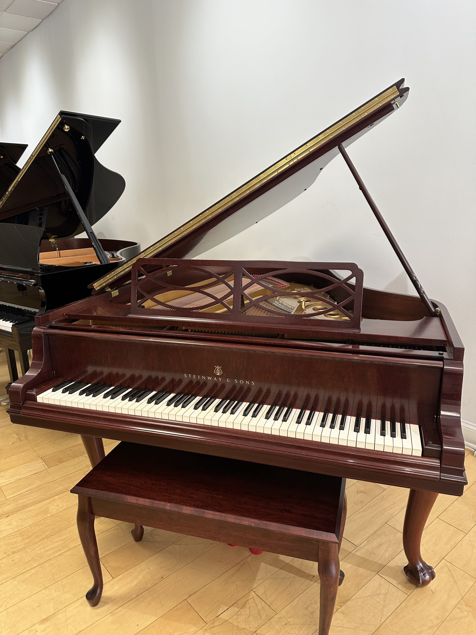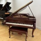 The Model M is often called the perfect balance—large enough to deliver true grand piano depth, yet compact enough for most homes. Paired with the warmth of mahogany and the elegance of Chippendale design, this piano offers both musical authority and timeless beauty.
